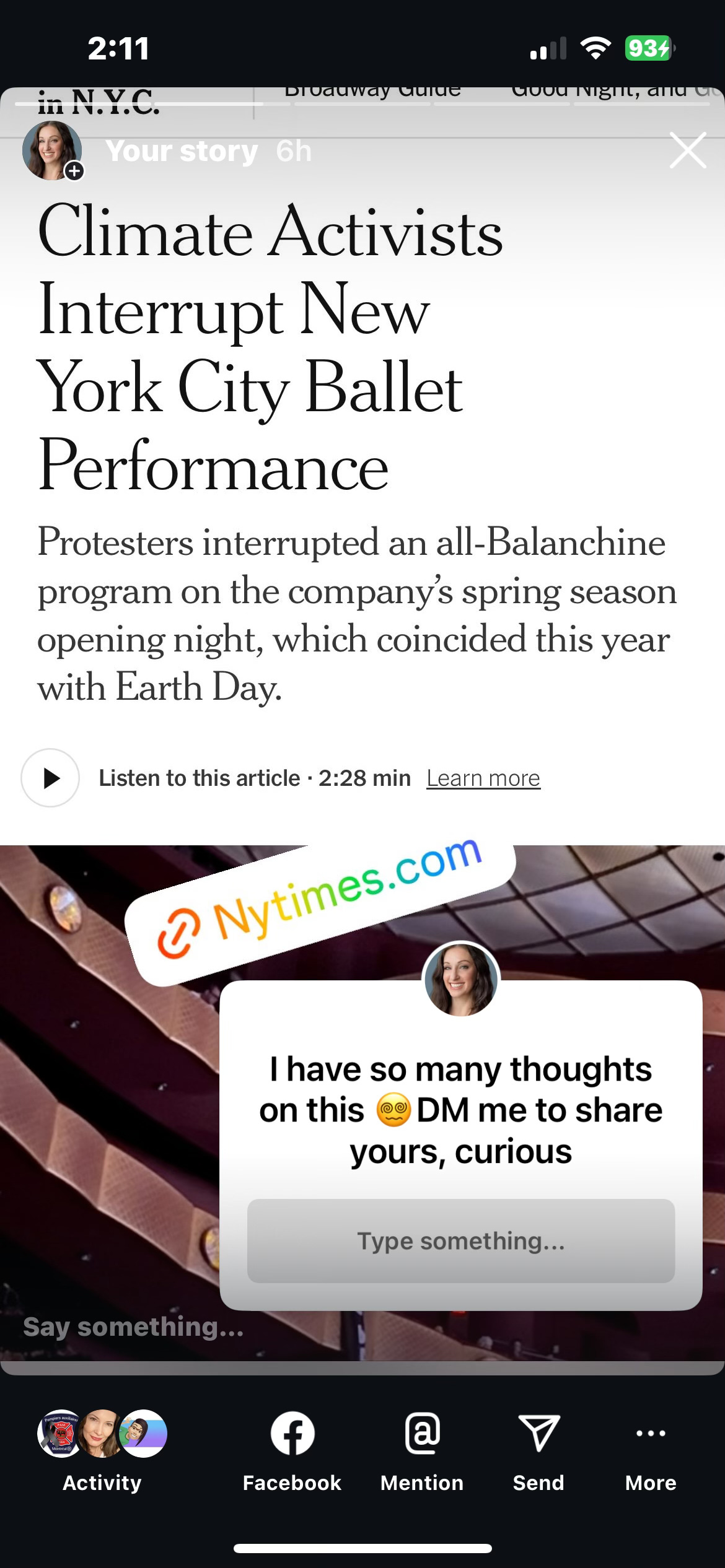 The headline covers it, but basically a group of protestors interrupted an opening night performance of Tiler Peck and Roman Mejia dancing Tchaikovsky Pas de Deux. They were there to protest the Koch family’s politics (this was at the David H. Koch Theater in Lincoln Center, and while the David Koch donated a boatload of money to the arts, he has also campaigned against science researching climate change). It was Earth Day, and protesters shouted “We’re in a climate emergency” and so on. The complaint being, our country is turning fascist and the wealthy and privileged are sitting here enjoying an elite art form and ignoring the world’s problems.